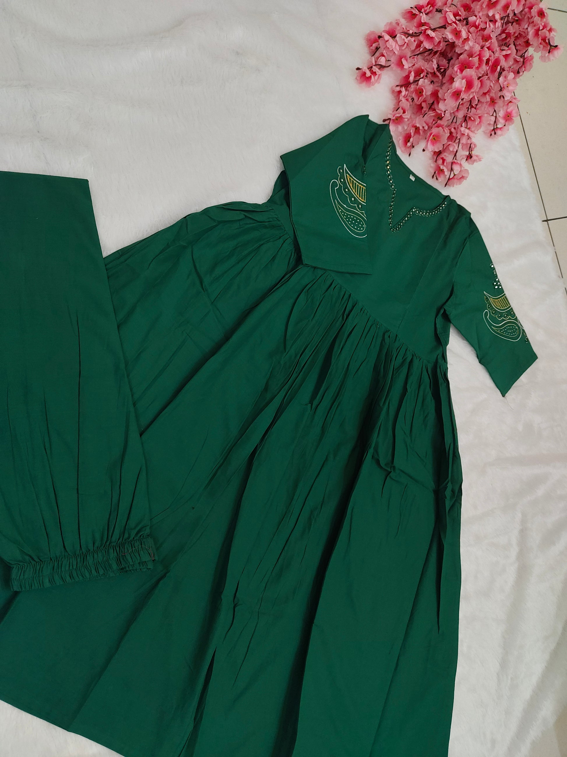 Step into elegance with our Emerald Green Anarkali Set, crafted to make every occasion memorable. Made from premium cotton fabric, this outfit features a flared Anarkali kurta with a V-neckline embellished with delicate gota lace detailing. The three-quarter sleeves and gold border dupatta add a regal charm, perfect for festive celebrations or special gatherings.